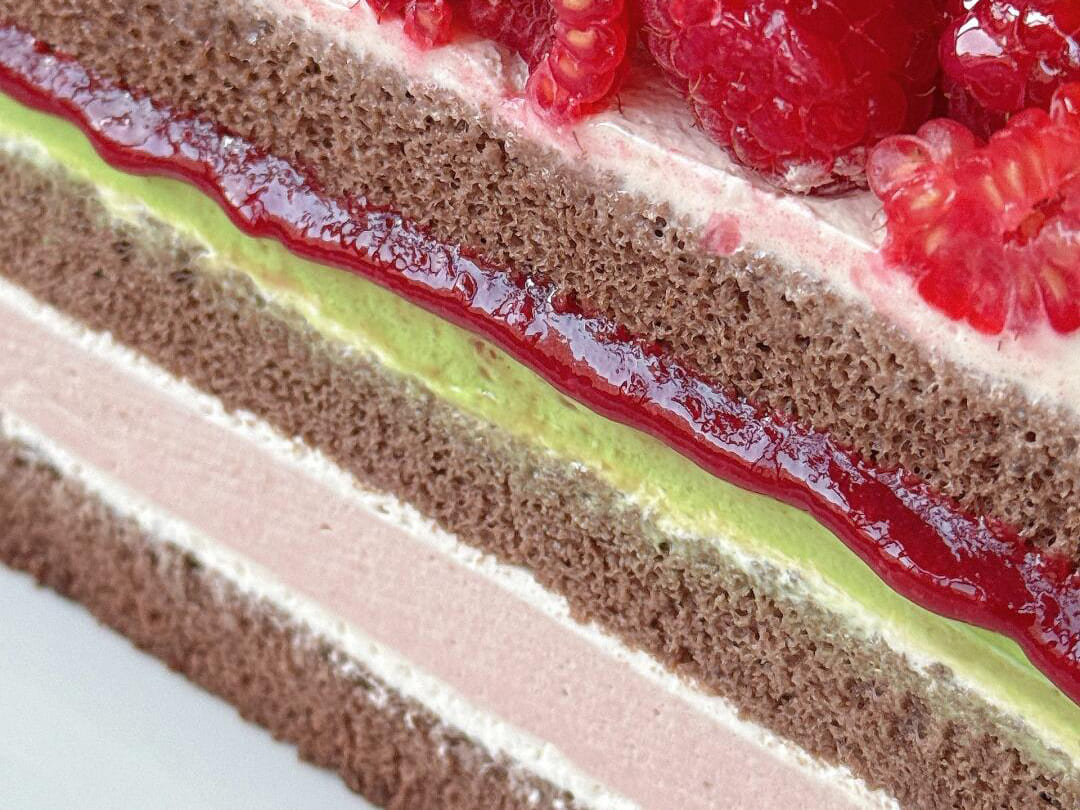 Fragrant raspberry confiture with creamy pistachio mousse — a sophisticated match of fruity sharpness and nutty depth.