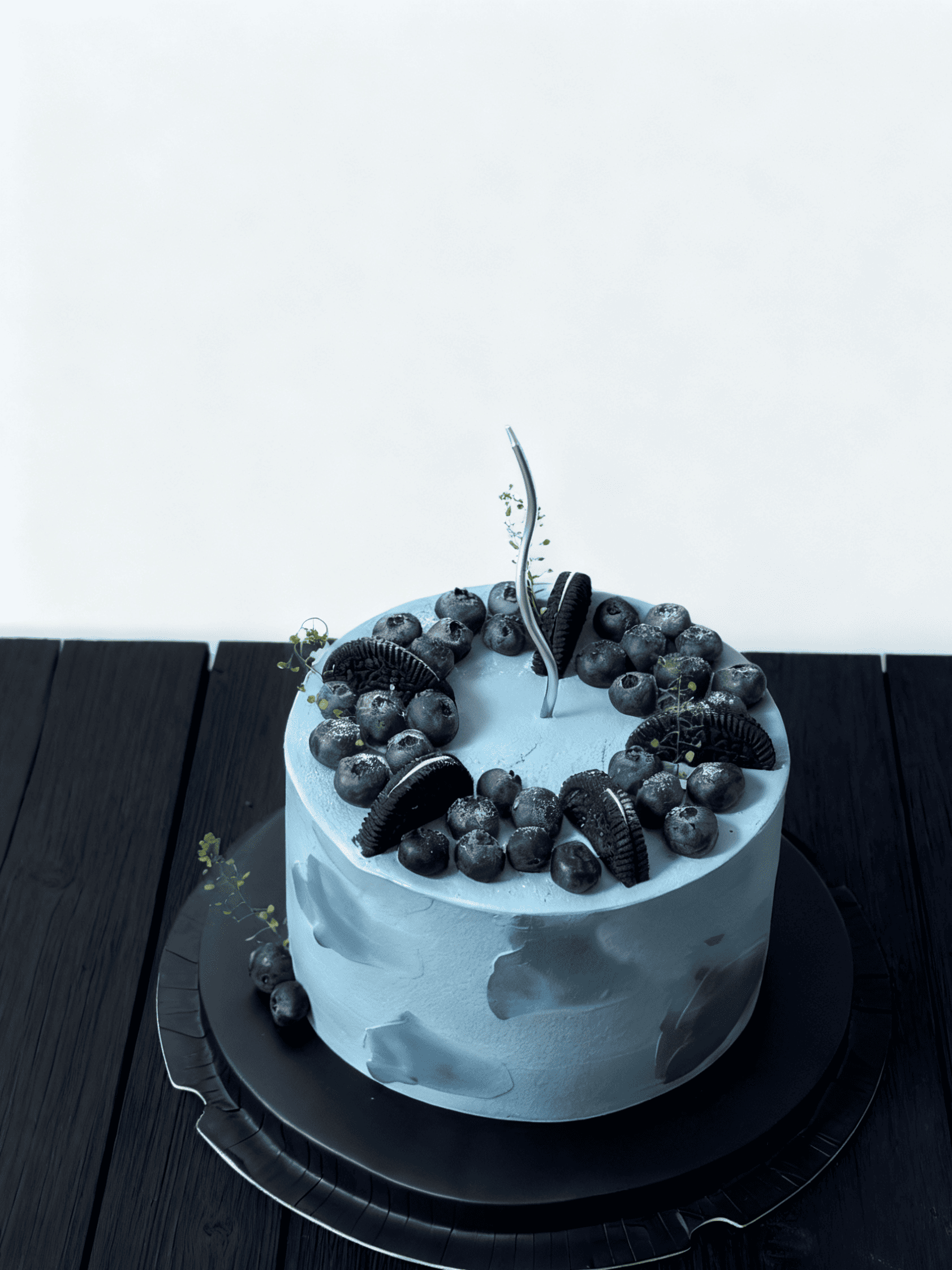 Our Blue Oreo & Blueberry Cake blends the bold taste of Oreo cookies with the juicy freshness of whole blueberries, all wrapped in an icy blue whipped cream exterior. The subtle abstract texture on the sides adds a modern, artistic flair, while the minimalist silver topper elevates the whole presentation.