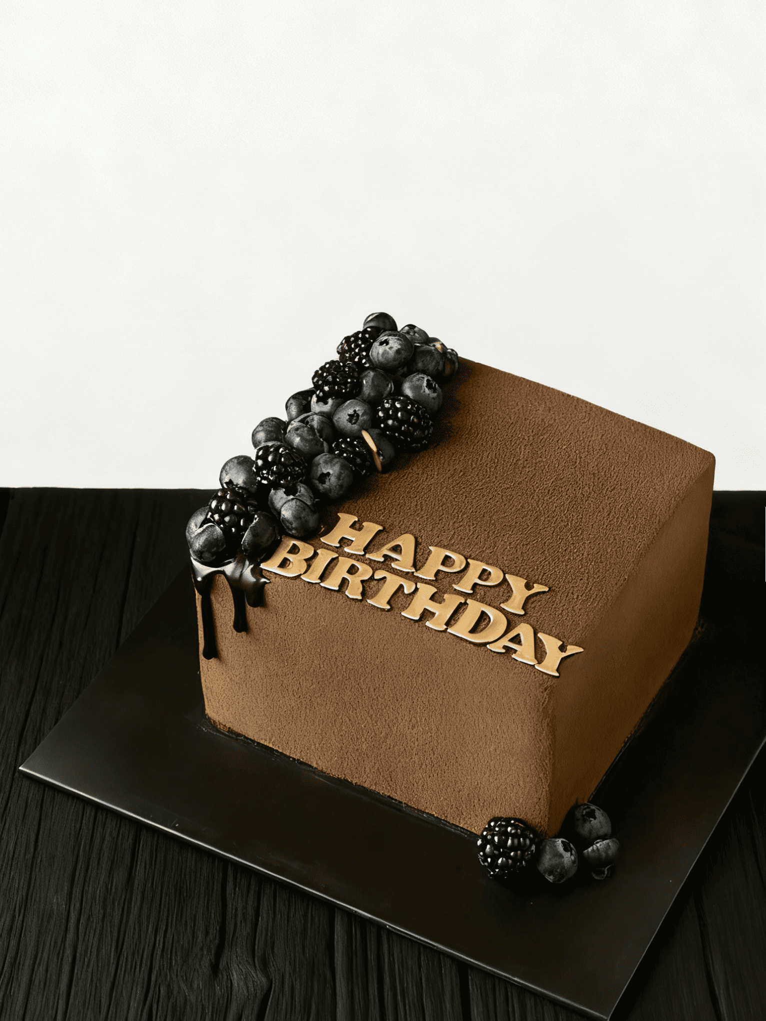 Our Velvet Cocoa Square Cake features a rich chocolate sponge wrapped in a soft cocoa velvet spray, topped with fresh blackberries and blueberries for a touch of natural elegance. Golden “Happy Birthday” letters add a refined celebration vibe, making this the perfect choice for gentlemen’s birthdays or corporate gifting.